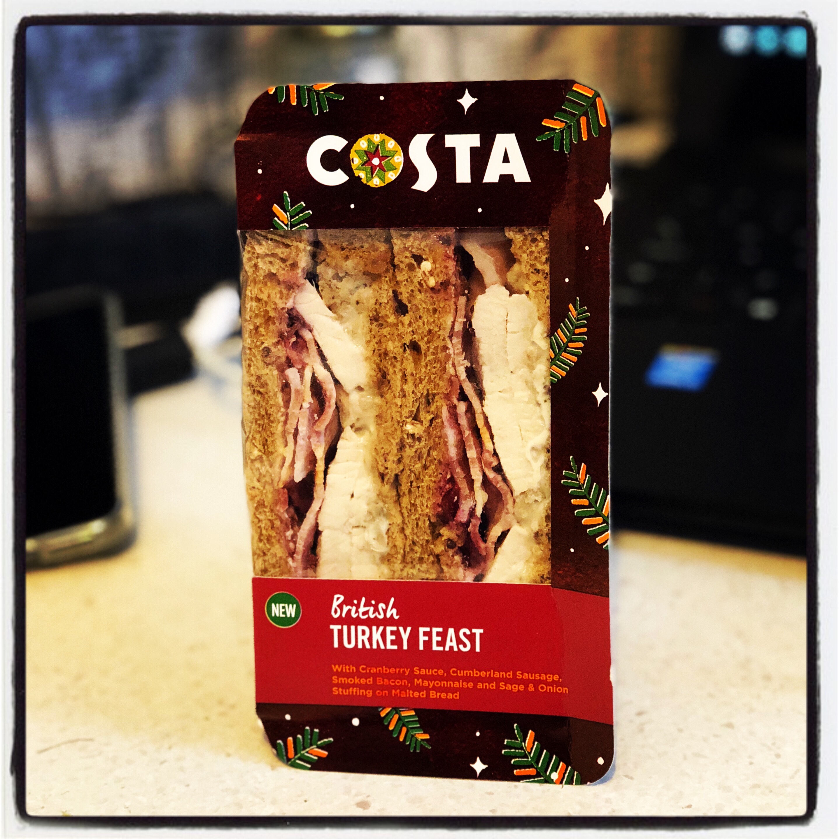 Today’s review is from Costa. That wasn’t the original plan. Originally I went for a very short, very slow run (hence just the headphones and watch) to Sainsbury’s. But Sainsbury’s had already run out of Christmas sandwiches. Is everybody else blogging about them now? So I went to Gregg’s and they had already sold out of their famous Christmas toastie. The next closest was Marks and Spencer, but I couldn’t go in there because the Big Issue lady was outside. I bought a copy off her a couple of Christmases ago and she gave me a big hug. Now, whenever I see her, she comes over and gives me another big hug. I’m not really the huggy sort with people I know, so I spend quite a bit of my life dodging Marks and Spencer unless I plan on also buying a copy of the Big Issue and being hugged. And I definitely had to avoid the hugging today because I was completely cashless. Now, I realise that saying you regularly dodge the Big Issue lady in the same breath as boasting about your watch/headphone set up that cost hundreds of pounds is very crass, but this is the world we live in now. Go on Twitter. There are thousands of people who live with their parents and have no discernible income, but somehow can afford an £800 phone which they use to talk about redistributing wealth and complain how life isn’t fair. We are all monsters now. Especially you.