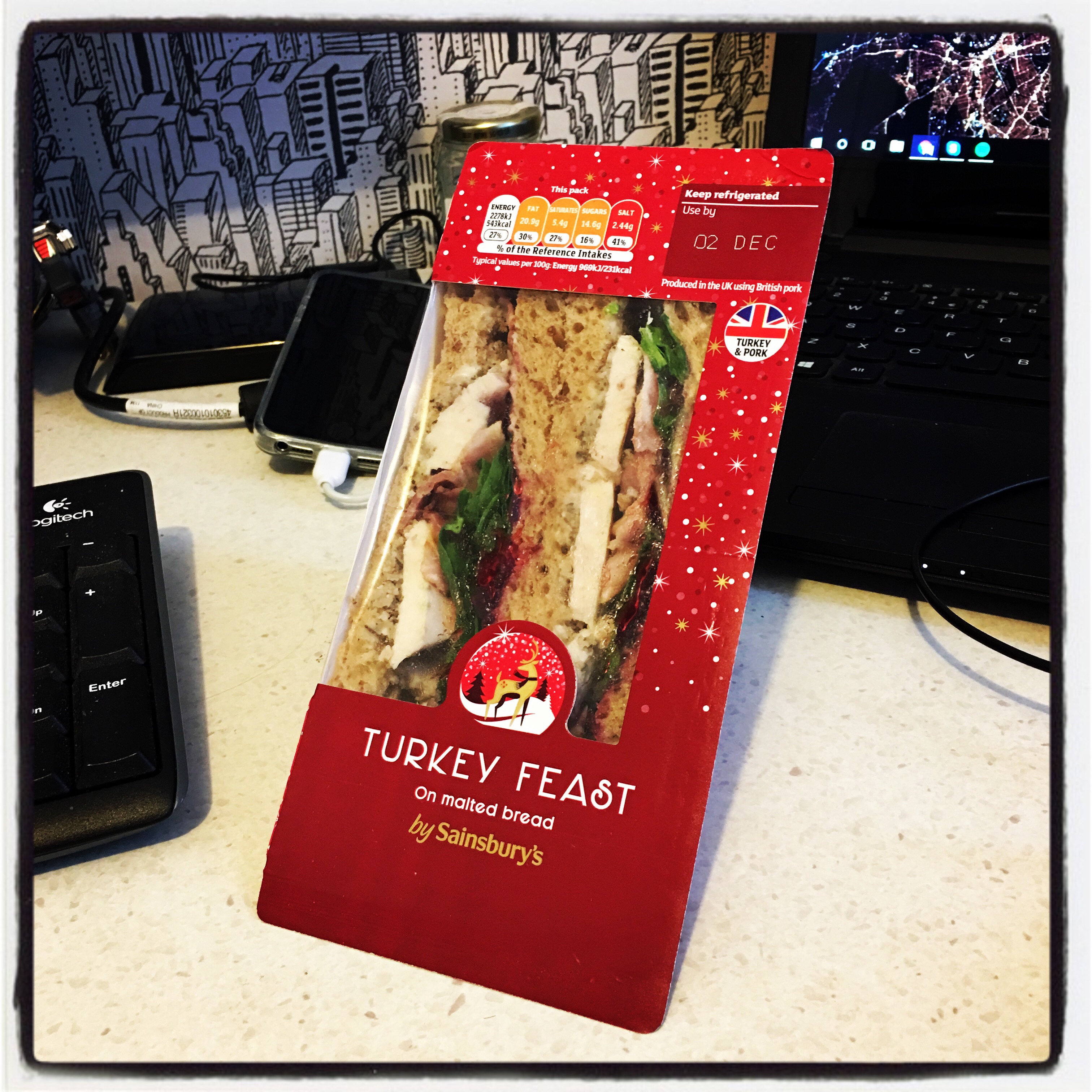 Hooray, Sainsbury’s got their act together today and had some Christmas sandwiches. I went back to Sainsbury’s because it’s the easiest to get to without the Big Issue lady hugging me. The Sainsbury’s, Greggs and M&S near me form a sort of triangle, and that’s her territory, patrolling the area waiting to pounce and dish out hugs at any minute. To get to Sainsbury’s you only have to walk along the border where it is usually safe, but M&S is pretty much the belly of the beast. I’m sure you’ll get to read about some awkward hugging later this month.