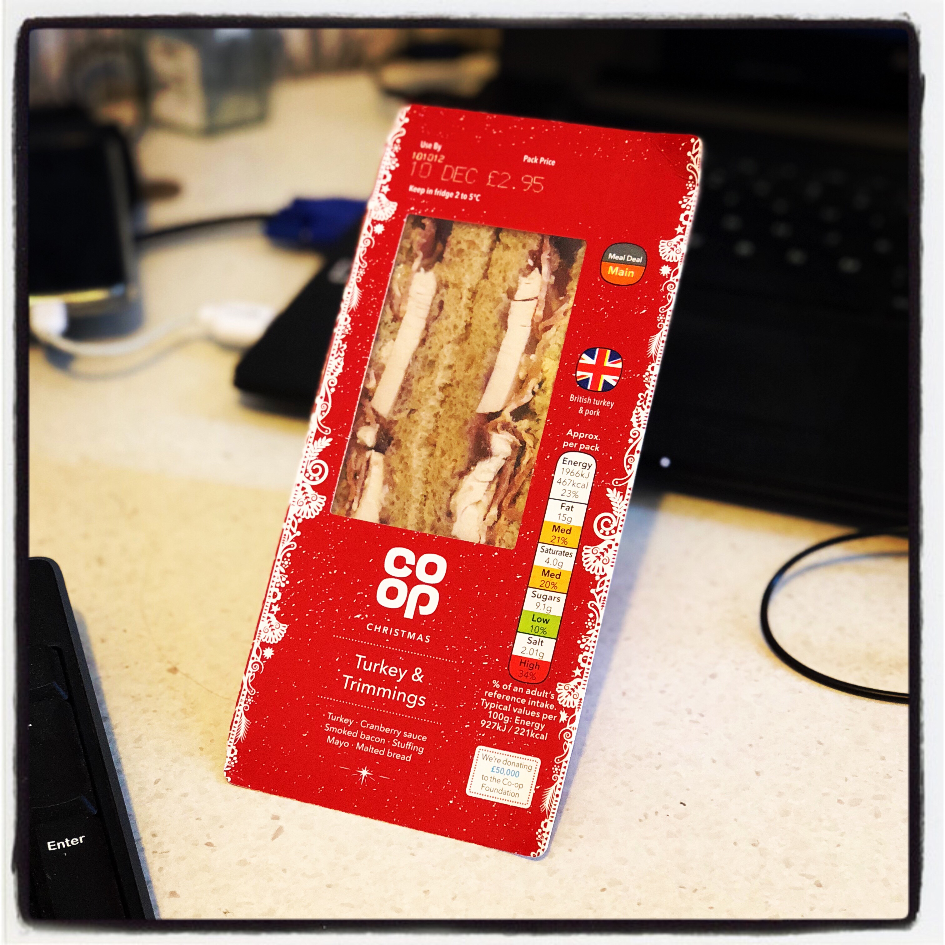 Today it’s the Co-Op, with Turkey & Trimmings. Like last year. More ghosts of the Sandwiches of Christmas Past. But OwO what’s this? It looks slightly different. 15p more expensive thanks to our wonderful Brexit voters, but it also has fried onions. And they’ve written mayonnaise on the ingredients, not mayo. Someone at Co-Op has been reading and understands my autistic moaning. So, will the 15p worth of fried onions make all the difference? Will it bring back a renewed sense of purpose for the world famous Christmas Sandwich and Lunchtime Errand Blog? HOLD ON TO YOUR CHRISTMAS AND /OR OTHER NON-DENOMINATIONAL HATS.
