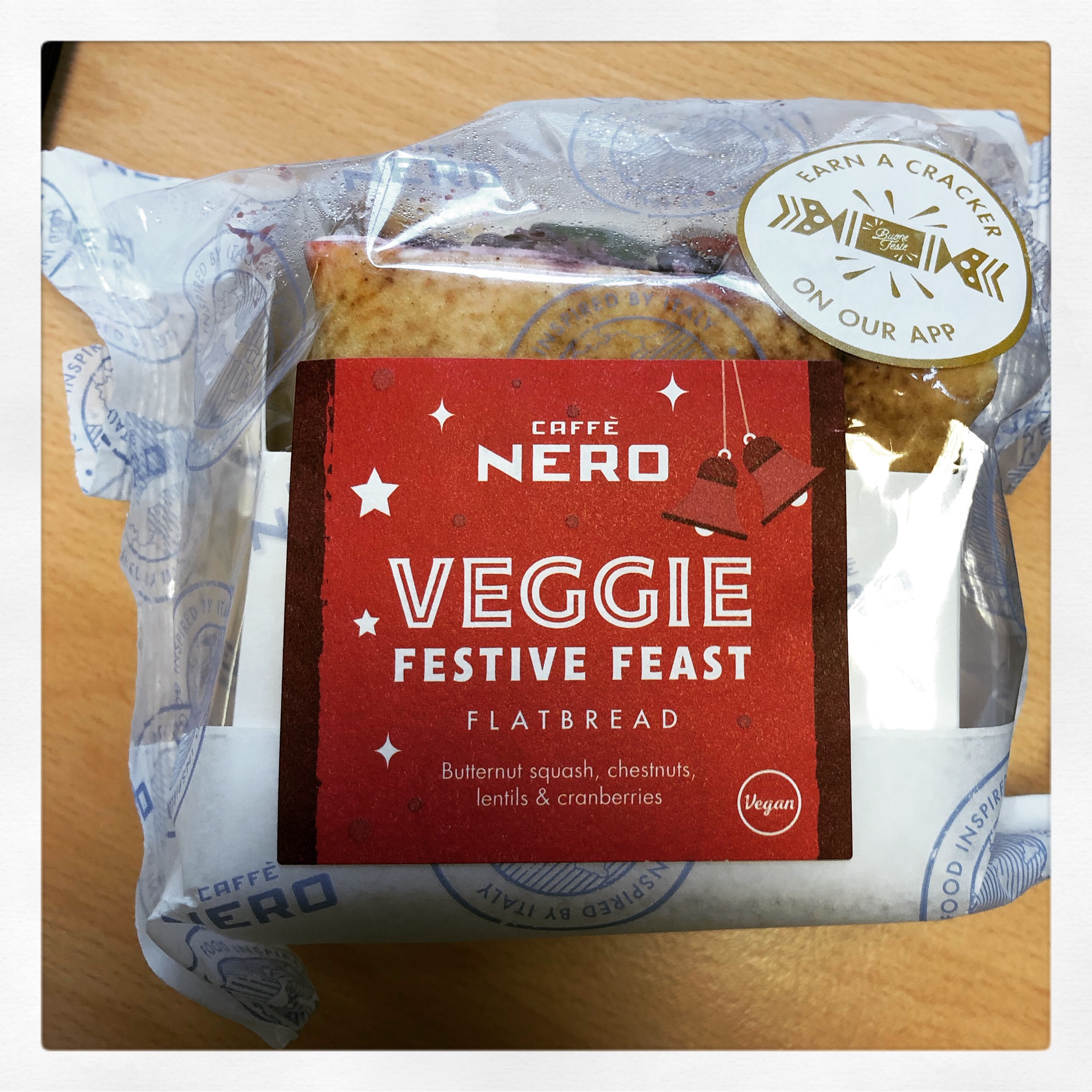 Remember when I mentioned the vegan mayo? Well, I still don’t know what it tastes like because everything in this wrap just tastes of pickled beetroot. But only if you could find any filling in the TOO MUCH FLATBREAD. Seriously, most of the time it just felt like eating a bread wrapped in bread wrap. So that’s your vegan Christmas from Nero. Is a loaf of bread with a single pickled beetroot baked into the middle a traditional vegan Christmas lunch? If it is, I take back what I said yesterday our meat-free future – the vegans must be stopped at all costs.