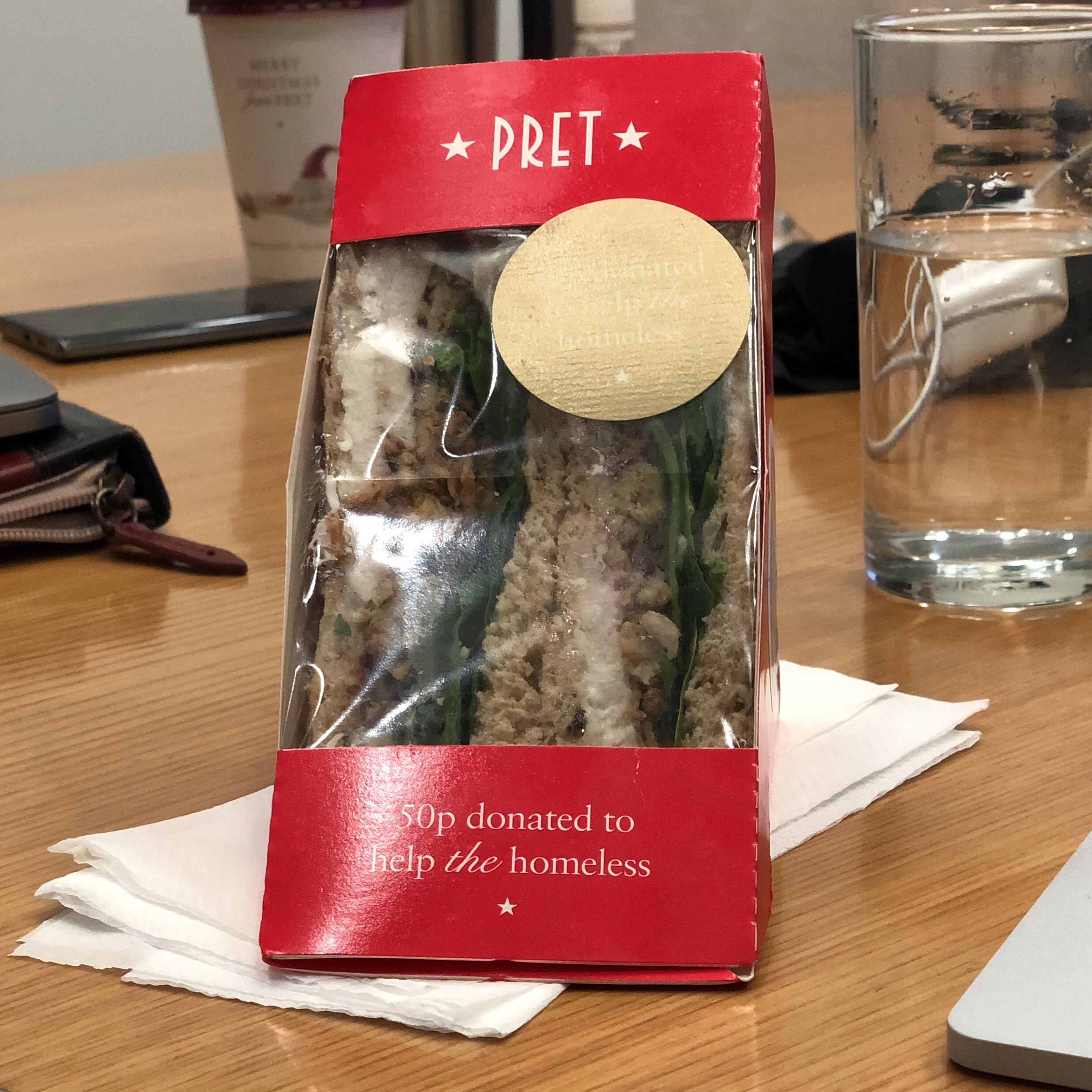 I’m in Canary Wharf today, and they have a Veggie Pret. But before you get your Brexit voting knickers in a twist, fear not! There are 478,000 normal Prets here as well, so I’ve gone for their traditional favourite. And do you know what? I didn’t have one last year because I was trying the vegan stuff, and I didn’t have one the year before that because for some inexplicable reason I couldn’t find any (see posts from 2017 for more info – Ed). So the excitement is palpable. Except it isn’t really because I’m secretly writing this in a room full of clients and they have no idea I have been running this wretched blog on and off since 2012.