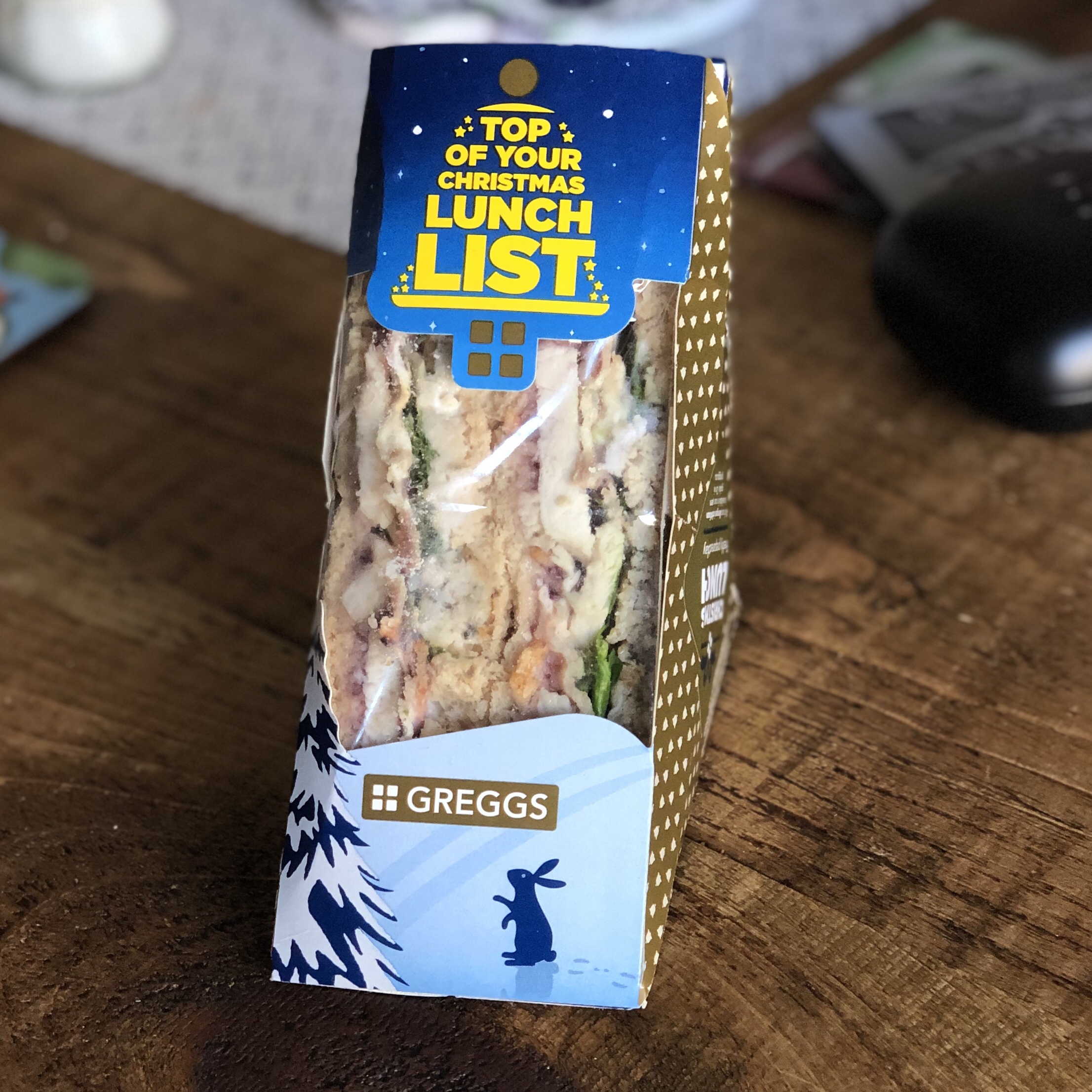 It’s the sandwich people (1 person) have been asking for, and it’s been hard to find because Greggs seem to sell out of everything by 11.58am every day. But on Friday night, I walked past Greggs at about 6pm and what did I see? Not one, but two Christmas sandwiches! So I got one and took it home for later. I didn’t fancy it for dinner on Friday (I’m not an animal) so put it in the fridge. On Saturday I had to head out for boat trip and didn’t get a chance to eat it, and then on Sunday, I was heading out all day again with my family and didn’t really have time to eat it. So, I had it for breakfast on Sunday (I am an animal).