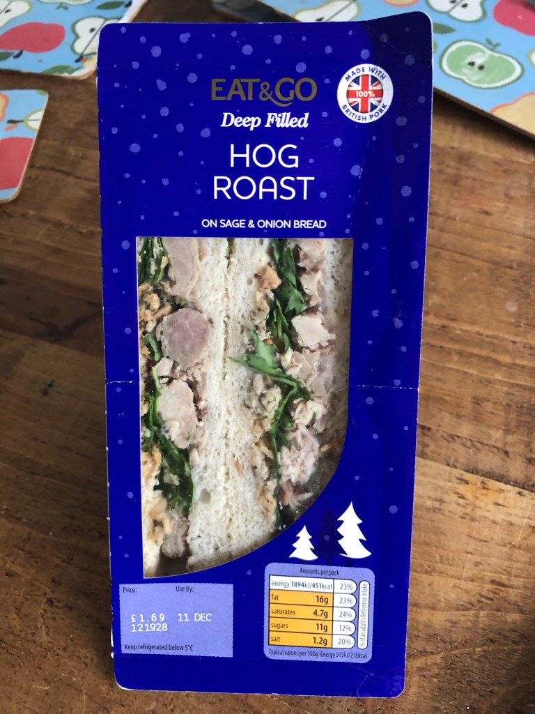 Aldi didn’t have any turkey sandwiches, so it was a choice between a turkey wrap or something completely different – hog roast! I assume this counts as a Christmas sandwich, the packaging has a little Christmas tree on it and everything. So let’s crack on.