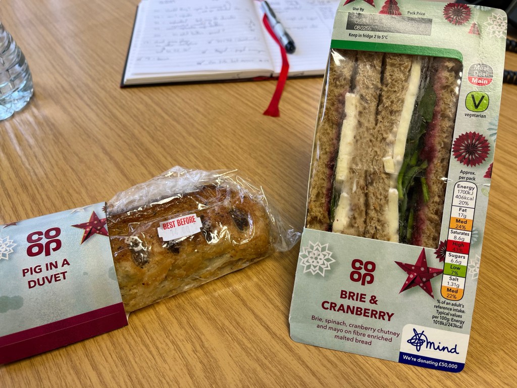 This Co-op looked like the shops did at the beginning of lockdown and had fuck all in it. I was lucky to the get the single Christmas themed sandwich left in the shop and they hardly had any other sandwiches either. But one thing they did have was a hot food cabinet and what did I spy in there? A Christmas themed hot sausage roll – the Pig in a Duvet. Sausage, bacon and cranberry in the flakiest pastry I’ve eaten for a long time. It went everywhere – over the desk, under the desk, in my moustache. And I’ll tell you what – I’m so glad I got that sausage roll because the sandwich was the most boring, bland cack. I get that sometimes keeping it simple is better than over complicating things, but this sandwich was as boring as one I had made myself. I don’t know what exactly it needed, it just needed a little more oomph. Maybe brie should always be slightly melted.