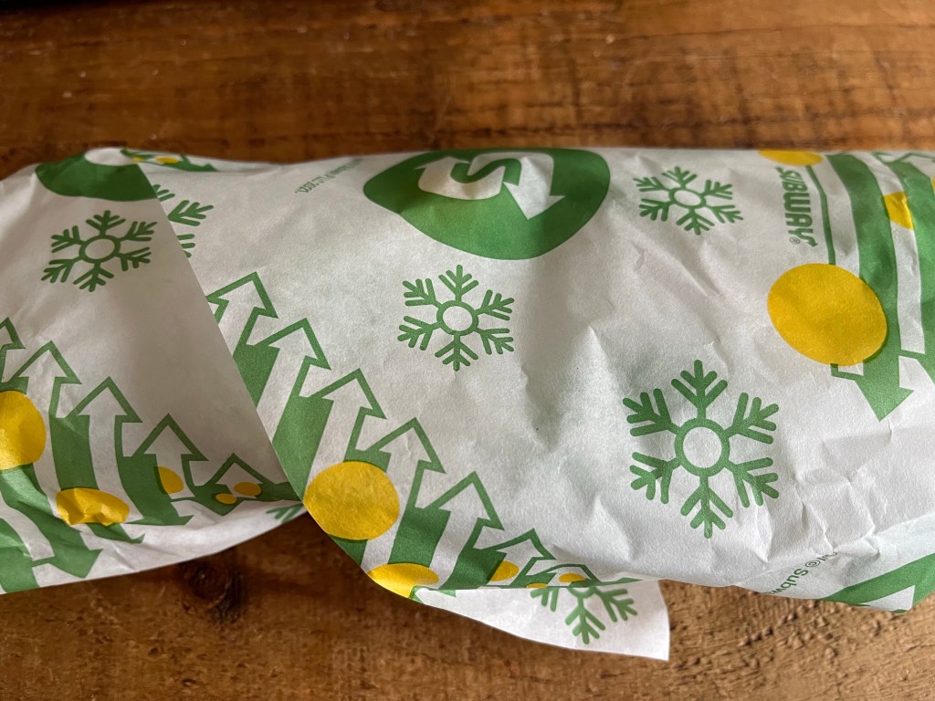 I went for a foot-long, of course, and I had it ‘cheese and toasted’, naturally, and added onions, mayo and, sigh, spinach because it’s the only vaguely Christmassy things they had. I know they’ve had cranberry sauce as a Christmas option in the past, but I haven’t seen that for years.