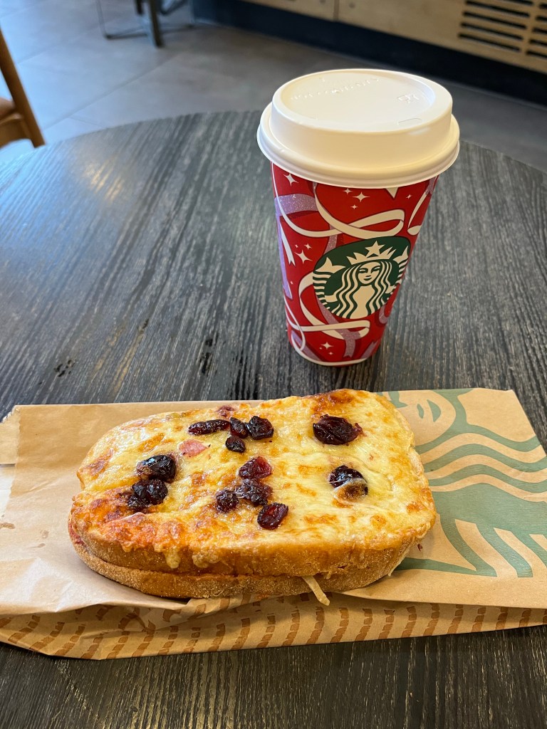 Yes, it is called A Toastie to be Thankful for. Horrible. Starbucks did have a turkey sandwich, they even had a turkey panini, but I had to go for this as it is something quite different. Does it count as a toastie of its microwaved? Either way, it was very hot and soggy and floppy and I burnt my lip on the melted cheese on the first bite. Lovely. After that, I took to tearing bits off with my hands rather than biting into it.