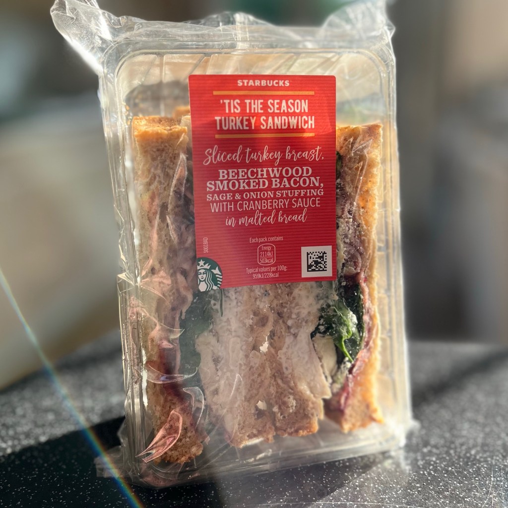 I bought this sandwich in Starbucks after going to the gym with the missus in the morning, when the car said it was -3.5 degrees celsius. And we got some drinks too. So there we were, in our gym gear with hot drinks and swanning around in the frost like proper gym/coffee wankers. Except we both don’t like coffee, so we had chai lattes. Skinny chai lattes. The biggest gym/coffee wankers of all!