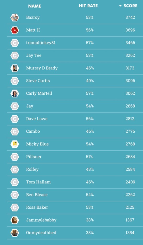We also won’t forget that last week I said it was too little too late for Bazroy and that my analysis was all completely wrong. In fact, he was still 4th from the bottom at the start of the quarter final stages so it has been a hell of a comeback. He was our inaugural football predictions winner and now joins Cambo as a two-time winner and will get to proudly place a little golden sandwich trophy next to his fisherman trophy, when he eventually receives it.