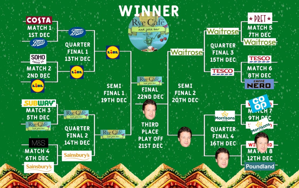 If there is one thing that jumps out, it’s that the left-hand side of the draw was a lot tougher than the right. Waitrose, ranked 7th, made it all the way to the third place play-off, lasting longer than Sainsbury’s, Boots and Morrisons who all had better sandwiches but went out in the quarter finals. Even cheeky mockney wanker Jamie Oliver was able to over perform, creeping into the final when both Lidl and Sainsbury’s were better and would’ve knocked him out.
