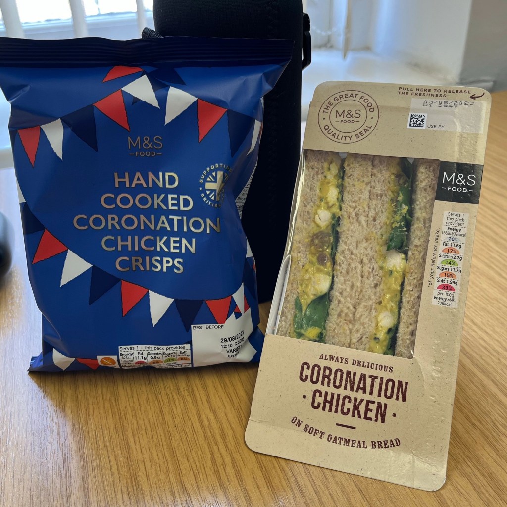 M&S did have a coronation club sandwich special on the shelves, but I could see the cucumber looking out at me from under the 6 slices of toasted bread so instead I opted for their bog standard presumably all year round coronation chicken sandwich. And some special coronation crisps.