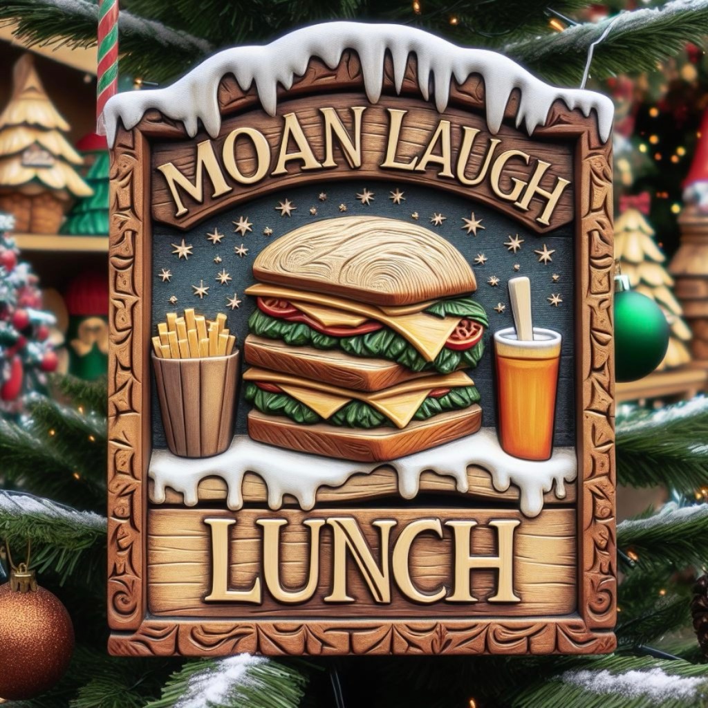 I must admit that I was quite taken by the idea of the Moan. Laugh. Lunch. wooden sign so I asked an AI to make one and it came up with some great stuff!