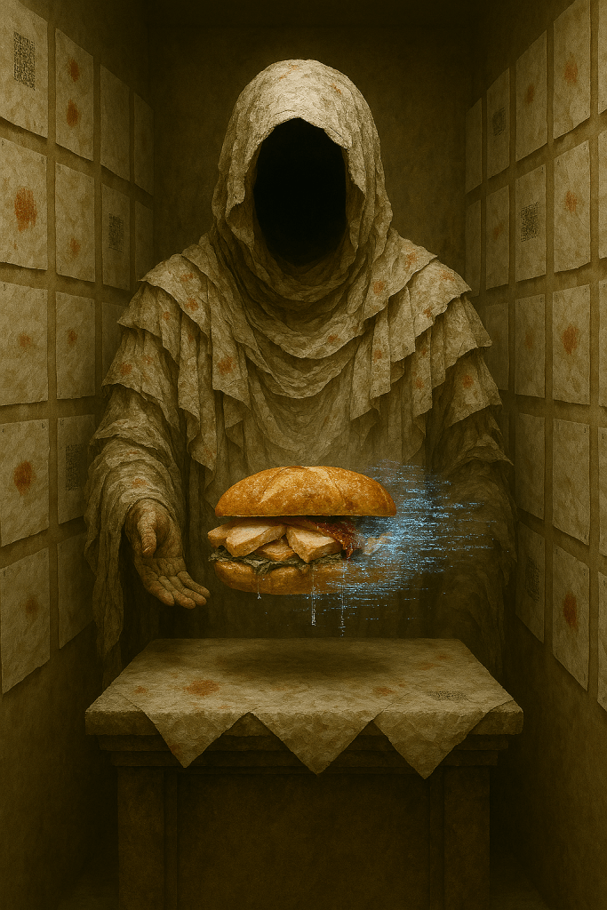 The figure was waiting. Its cloak had changed. QR codes shimmered faintly across its folds. Some napkins were stitched with binary, others damp and curling at the edges. It did not speak. It only raised its hand.