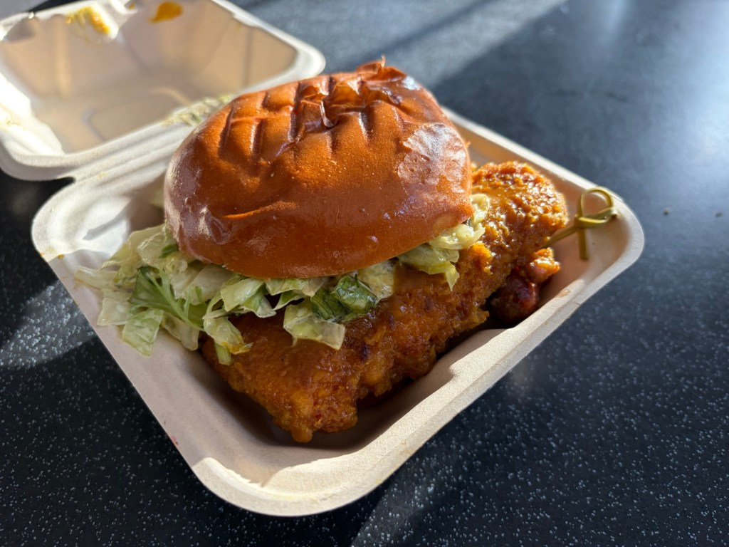 Crispy katsu chicken breast coated in a ritz cracker crumb, a golden katsu curry sauce, cranberry and clementine jam, iceberg lettuce in a curried mayo and a hot maple pig in blanket on a toasted brioche bun.